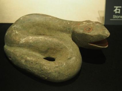在成都金沙遗址的祭祀坑中也发掘出一些石蛇,大多盘绕于地,蛇首以黑色、朱色彩绘出眼眶、瞳孔等特征。