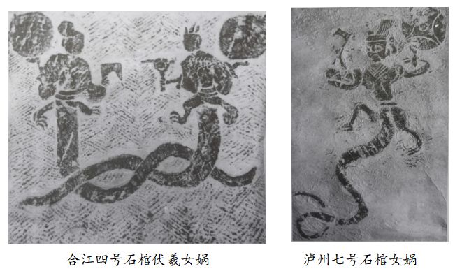 新津县出土了多幅伏羲女娲画像,上图中的画像出自宝资山东汉崖墓石函。画像中,左为女娲,手举月亮,月中有桂树和蟾蜍。右为伏羲,手举太阳,日中有三足乌。伏羲女娲都是人首蛇身,两尾相交,头戴冠帻,身穿宽袖长袍,衣带飘飘。