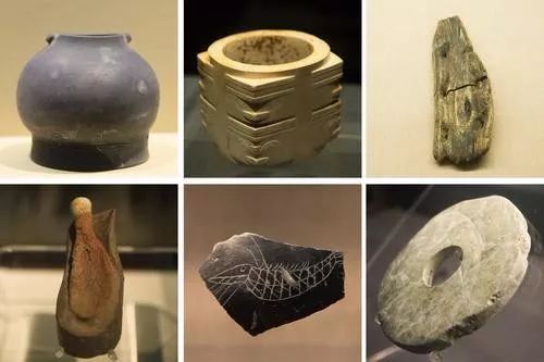 良渚文化遗址出土的黑陶器、玉琮、木屐、漆器、陶片和玉璧(左上起,顺时针方向)(翁忻旸 摄,图片来源:金融时报)