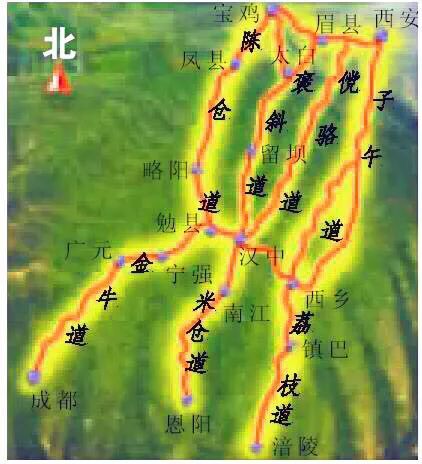 在中国古代,蜀道穿越米仓山、大巴山和秦岭,连接关中和蜀中,是打通南北丝路,进而把大西南、大西北等广大地区结为一体的庞大交通体系。大体以陕南汉中为枢纽,这一南北向的交通网络体系又可分为两大部分:北部由西向东,依次主要有故道、褒斜道、傥骆道、子午道等线路;南部亦由西向东,依次主要有金牛道、米仓道、荔枝道等线路。诸此通道均曾在古代南北交通中起过重要作用,并陆续在先秦秦汉以来逐渐见于记载,学界对其秦汉以降历史的探讨也亦取得了不少成果。但其起源和早期发展阶段的情形,仍扑朔迷离,很不清晰。