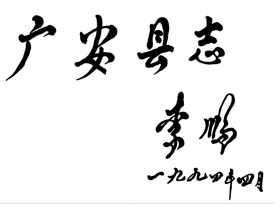 1994年4月,应广安县人民政府请求,时任国务院总理李鹏为广安第一部社会主义新方志《广安县志》题写书名。