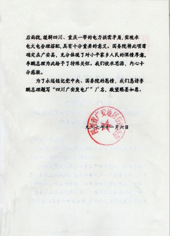 请示送到国务院不久,1998年2月,国务院总理李鹏亲笔题写“四川广安发电厂”墨宝寄到了广安(现保存于广安市档案馆)。