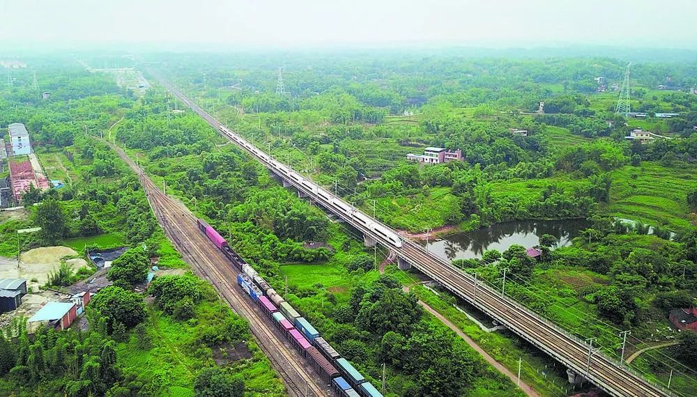 ▲ 成渝铁路(左)和成渝高铁双线并行在一起。新华社/图