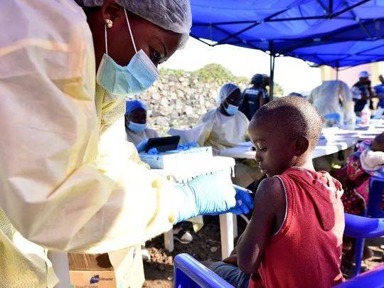2019年7月17日,在刚果(金)戈马,医护人员在为一名儿童接种埃博拉疫苗。图据新华社