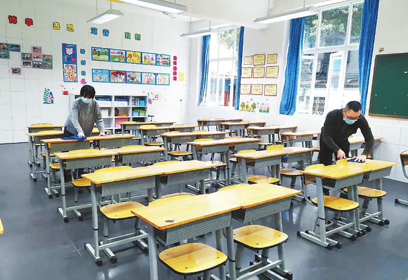 成都市泡桐树小学值班教师对教室进行扫除。本报记者肖雨杨摄