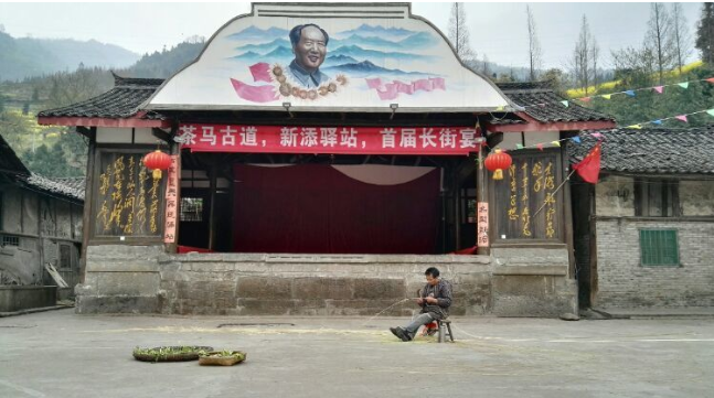 新添老街上保留的“兴盛店”和“兴发店”等茶店子,还可以让人们追忆那段茶马古道繁荣的岁月。老街正中,有一座木结构的戏台。当地村民说,这戏台的历史多半上了百年。几十年前赶场天,戏台就会演大戏,敲锣打鼓之声让热闹的乡场更加喧嚣。如今,往日热闹的戏台上已不见戏子的踪影,这里成为了人们的休闲娱乐场所。