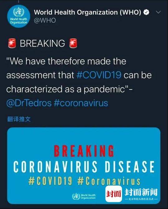 日内瓦当地时间3月11日,世界卫生组织正式宣布新型冠状病毒为世界大流行。