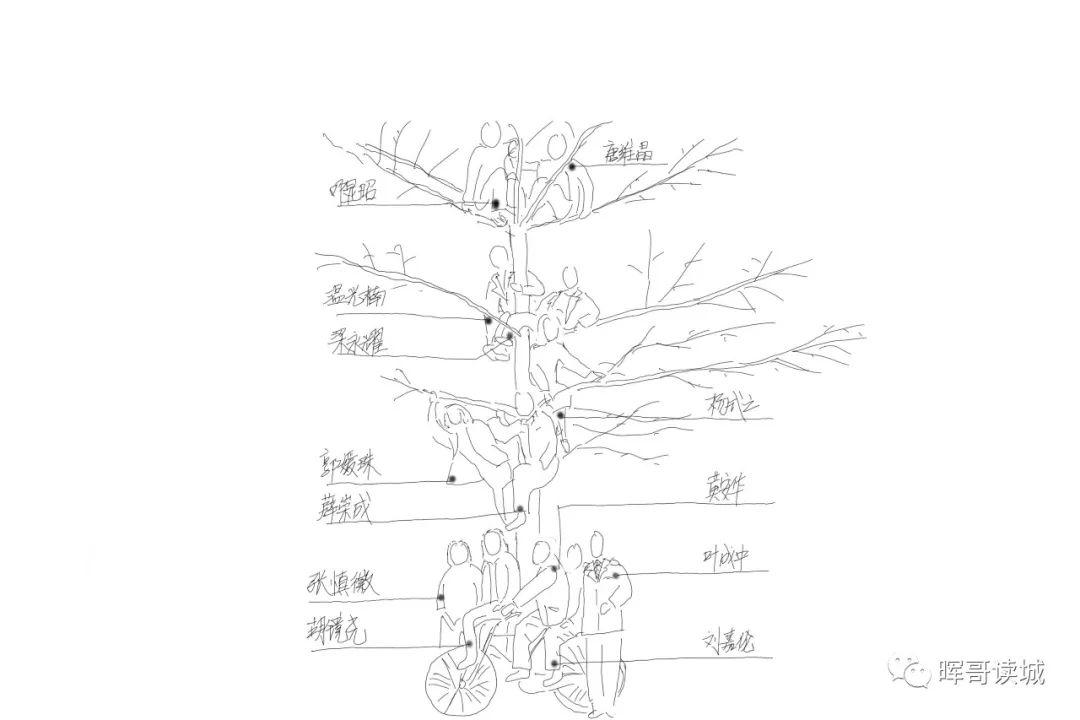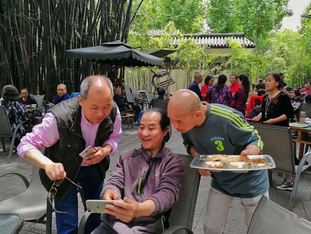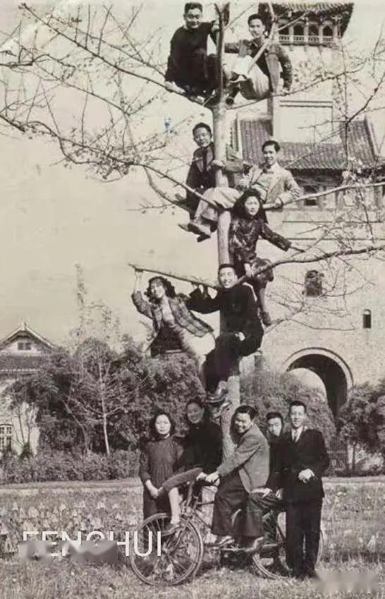 1941年,90多位高中毕业生考入华西协合大学医牙学院。医牙学院一共要读7年,要求非常严格,淘汰率高。经过3年的学习,只剩下 13位同学继续在该专业学习。他们结拜为兄弟姐妹,以长幼排序。1944年,其中12位同学相聚在一起,欢送排行老三的叶成中参加远征军,抗击日寇。大家爬上了钟楼对面荷花池弧顶西边第一棵树上,用叶成中的相机,请人拍下了这张珍贵的照片。