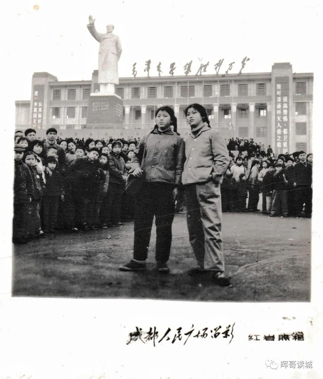 1969年,就是成都的毛主席塑像和万岁馆建成的那一年。纪素君和妹妹纪素群在广场合影。纪素群当时在成都二中读初三,准备下乡到四川省雅安市名山县。姐姐纪素君在广元上班,得知消息后特意赶回成都。广场上只有一家照相摊点,是红岩相馆设立的,排队等候的人非常多。远处是毛主席塑像,塑像后面就是万岁馆,屋顶有“毛泽东思想万岁”几个大字。