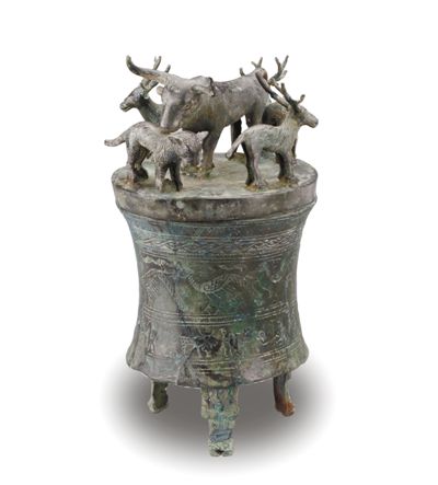 此类贮贝器都是用击破鼓面的废铜鼓改制的,即将破碎的鼓面去掉另加一盖,再于原铜鼓的圈足处焊接一底,使一件本应回炉改铸的废铜鼓变成一种新的器物。