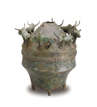 它们的形态和一般贮贝器的形制相去甚远,也可能是一种代用品(图⑦:西汉七牛圆锥形盖铜贮贝器)。也就是说,它们原来并不用于贮贝,为了贮贝才临时借用的。只是我们现在还不知道器物的本来用途,故将其列入异形贮贝器一类。