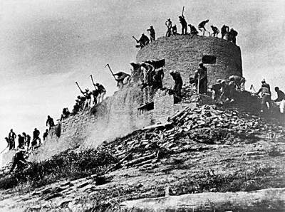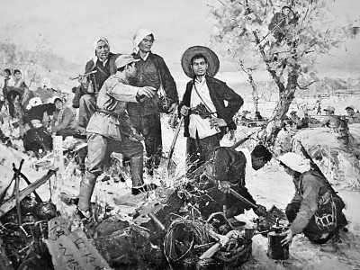 百团大战后,民兵在拆除日军防御工事。资料图片