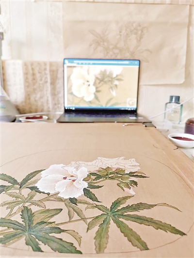 天津美术学院学生通过网络课程跟随老师学习绢本白描设色。