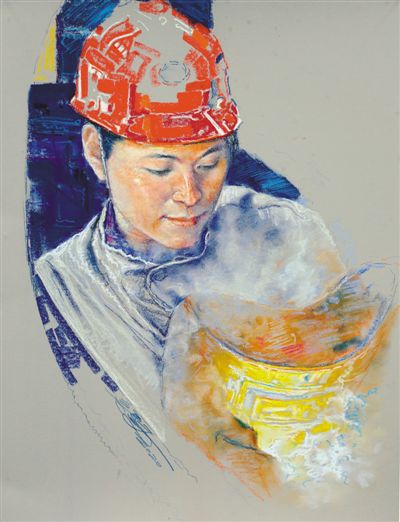 应金飞色粉画《女焊将》——纯净的蓝色,映照出广大工人敬业爱岗的模样。技术工人队伍是支撑中国制造、中国创造的重要基础,凝聚起同心筑梦的磅礴力量。