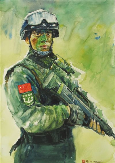 李晓林水彩画《特战队员》——斑斓的迷彩绿,彰显军人的热血担当。无论是在训练场磨砺青春,还是在抢险救灾最前线挺起不屈的脊梁,铁骨铮铮永远是军人的气节。