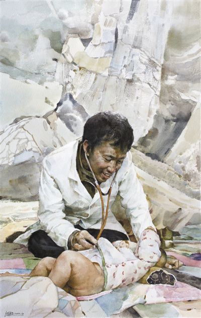 刘永健水彩画《心系苍生》——圣洁的白色,饱含医务人员对生命的敬畏,照亮以仁心仁术造福人民的信念。