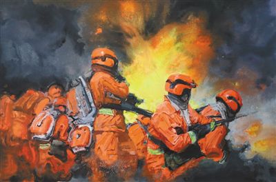 陆庆龙水粉画《烈火英雄》——鲜亮的橙色,闪动着消防人无惧危险、逆行而上的精神之光,它照亮希望,给人生命的力量。