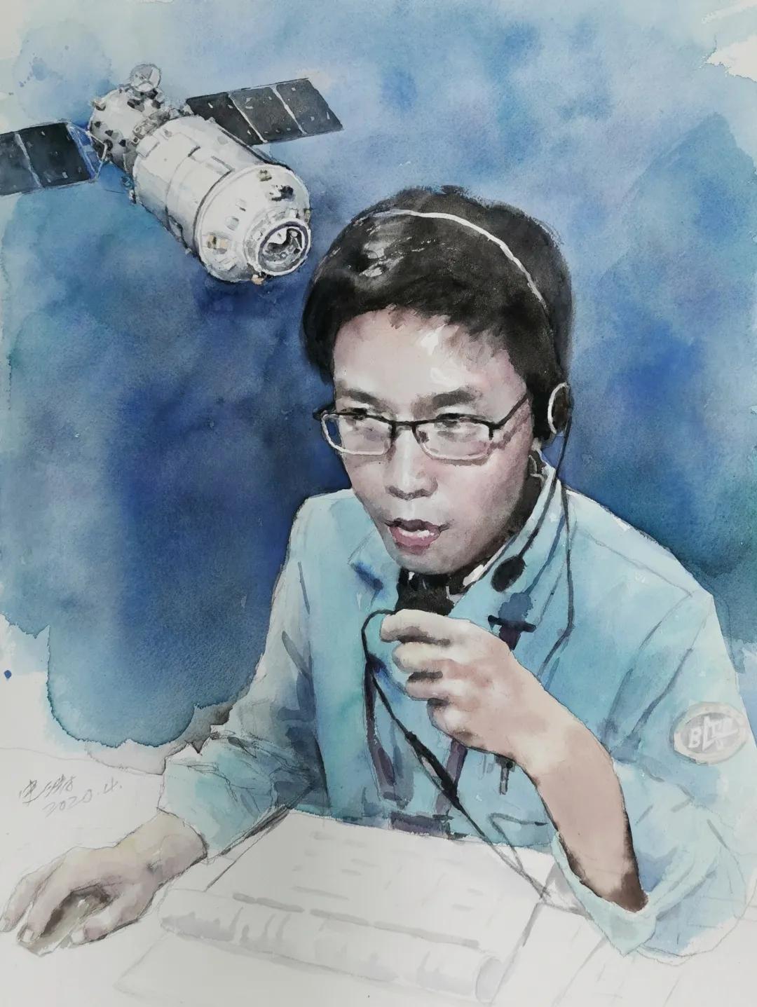 史涛水彩画《太空“牵风筝”的人》——天青色,是一线航天测控人的奋斗写真。那一抹天青,与他们严慎细实的作风、追星揽月的力量和鸣,共同定义青春。