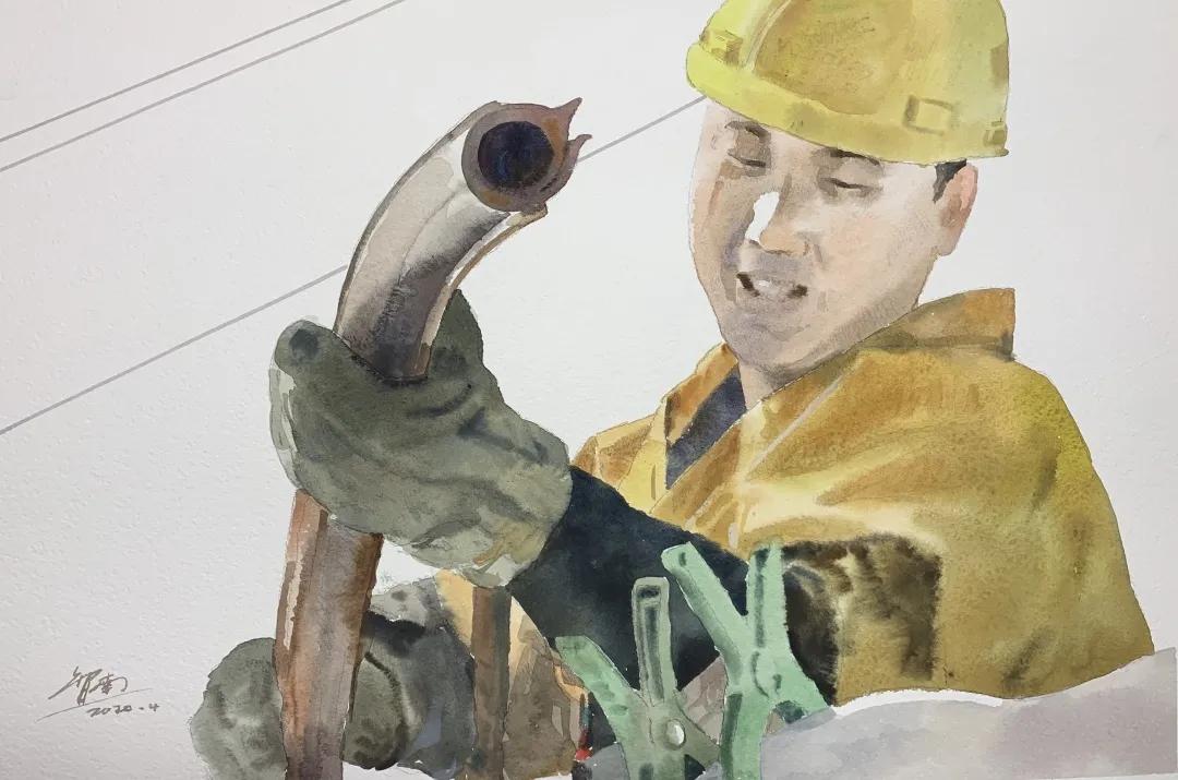蒋智南水彩画《行走在高压线上》——醒目的黄色,在他们身上成为安全提示的警戒“信号”。保障万家灯火,正是电力工人的使命与担当。