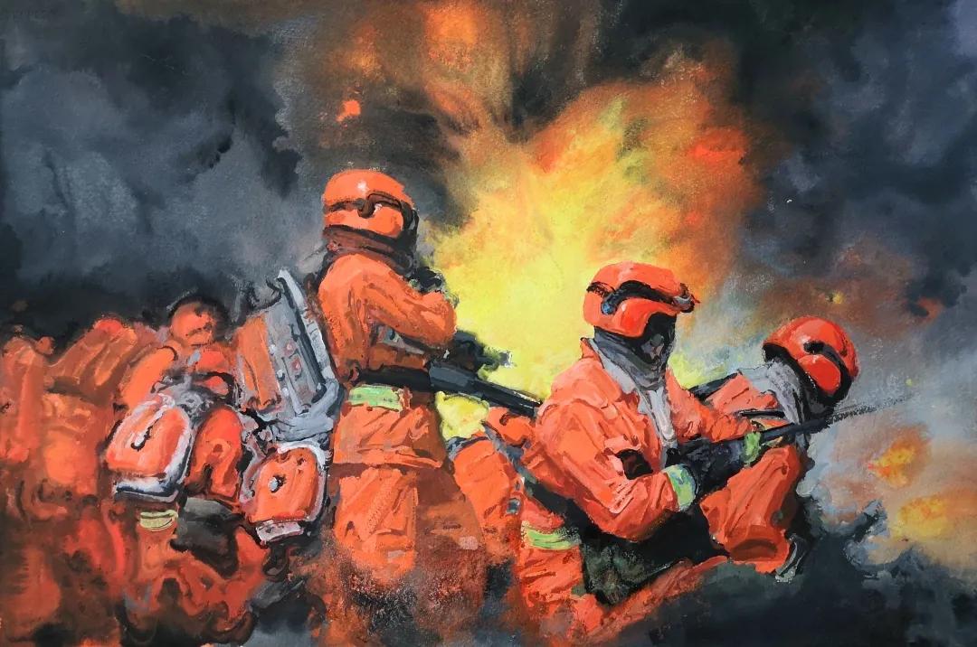 陆庆龙水粉画《烈火英雄》——鲜亮的橙色,闪动着消防人无惧危险、逆行而上的精神之光,它照亮希望,给人生命的力量。