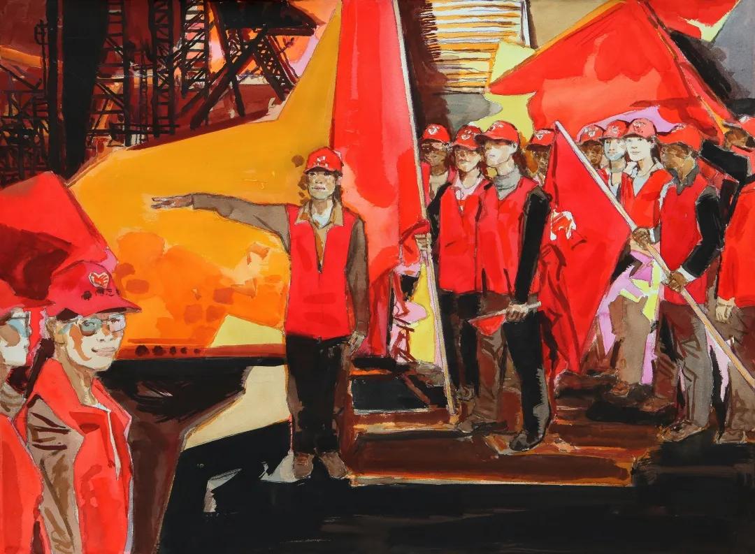 周刚水彩画《不负韶华——我们是青年志愿者》——一抹志愿红,象征着“奉献、友爱、互助、进步”的志愿精神,这既是青春的温度,也是爱的传承。