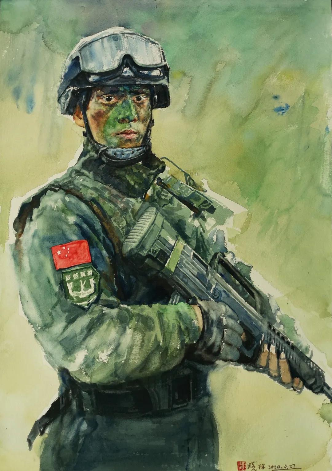 李晓林水彩画《特战队员》——斑斓的迷彩绿,彰显军人的热血担当。无论是在训练场磨砺青春,还是在抢险救灾最前线挺起不屈的脊梁,铁骨铮铮永远是军人的气节。