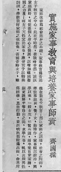1938年,齐国樑的《实施家事教育与培养家事师资》一文刊登在《教育通讯周刊》上。他就家事教育与女子教育的关系,如何培养家事教师等内容进行了剖析,“家庭改善为社会进步之基础,家事教育为普通女子教育之中心”。良好的家庭可以促进个人的身心发展,这样就可以增加建国卫国的力量。女子天性就是适于家事的,但兴学以来,一般的女生初骛高远,鄙视日常家务,以为这样才是男女平等,这种想法是错误的。