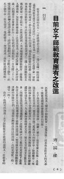 文中,齐国樑在回顾中国女子师范教育发展历程的基础之上,提出女子师范教育应当从质量、设置、课程以及训练等方面进行改进——