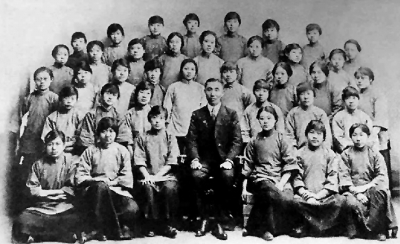 直隶第一女子师范学校第十三学级学生恭送校长齐国樑(中)赴美留学合影,其中五排左一为许广平。