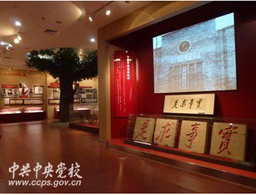 中央党校校史馆校史展第二部分《延安时期的中央党校》展厅,赫然摆放着四块白沙岩石碑,上面镌刻着毛泽东主席手书、由延安中央党校学员舒同临摹放大的“实事求是”四个大字(图片来源:共产党员网)