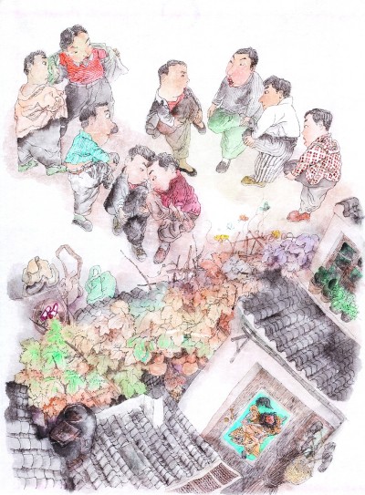 对那个年代喜欢画画的儿童来说,心目中最崇拜的就是神笔马良,一支笔在手,要风有风,要雨有雨。遨游在一张画纸里没有了真假,只有“我想”!凭着自己的意志天马行空。记得小时候画的内容大多是马上英雄手握宝剑、长枪,或飞机、大炮、坦克,一张张画都藏着长大后的理想。而如今我津津有味地一笔一笔地追忆着童年的往事,玩啊、吃啊、闹啊,那些一幕幕淡忘了的场景,一件件模糊的趣事,一个个刻在内心深处的人物在纸面上慢慢地呈现出来。骑在爷爷的肩膀上,上街看花灯;牵着外公的大手,下河学游泳。或伏在外婆的怀里,听故事,或头斜靠在奶奶膝盖上,挖耳屎。久违的亲情,只有到现在才真正回味出那是那么的甜!还有,那些四周邻居,偶尔遇见的陌生人,只要他们能吸引孩子的眼睛,就是迷,就是欢乐。什么包馄饨、包粽子、做团子,杀鸡、杀鱼、洗螃蟹,还有弹棉花的、修鞋的、磨剪刀的、吹糖人的等等,都是童年生活的一部分。爱热闹喜稀奇的孩子,总企图发现什么,专注认真!一个场景,一个形象,一个道具,没有照相机咔嚓咔嚓地拍,却牢牢地储存在了头脑中。嘿!那些花样经,成了现在笔下追忆的线索与模板。