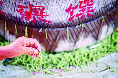 我跟表兄弟姐妹们好奇地跟在大人身后,看着他们乐呵呵地拿着镰刀到地里去,又看着他们像孩子样笑闹着割下一把把青色麦穗,灵巧地捆成一个好看的结,再看着他们围坐在一起,把麦穗放在簸箕里一把把地搓着,直到把饱满的青麦粒搓出来。一股奇异的清香吸引着我们蹲到簸箕跟前,试着拿起麦粒一口咬开里面的浆汁,之后便陆续“呸呸呸”地吐着喊:“真难吃!真难吃!”大人们并不计较我们的恶作剧,专心地把麦穗搓完,尔后拿到一边的石磨旁边,用一只大茶缸把麦粒缓缓倒进石磨中间的孔里去。我们瞪大了眼睛:麦粒们经过大石磙的碾压,变身一段段散发着特殊清香的“绿毛毛虫”!孩子们发现新大陆一般吵闹着要去推磨,想亲自看着麦粒在自己的手下“变身”,结果自然是推不了一会儿,便厌烦了各自散开去玩耍。