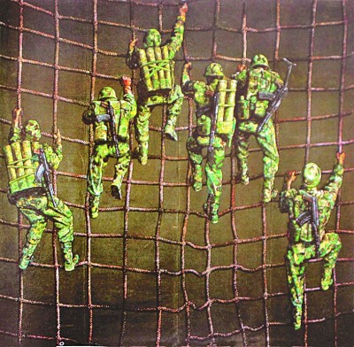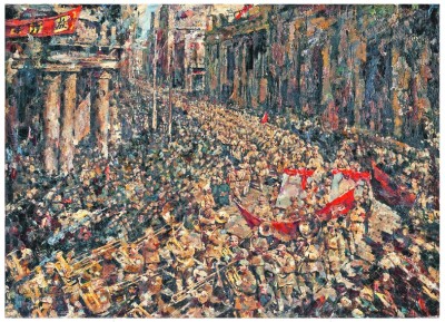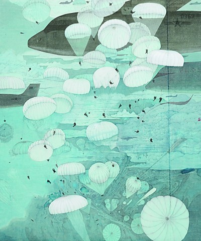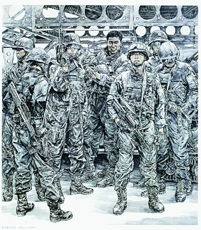 信息时代拓展了军事题材美术创作的内涵与外延,从而使其在美学特征、风格趋向与精神诉求等方面发生了新的变化。“迷彩系列”是邢俊勤试图以现代艺术符号去改变传统主题创作的新尝试。其作品《红砖墙》《第二小分队》中的迷彩符号的确立仅仅是一个细微的点,而其背后承载的是艺术家广博的人文情怀与渴望和平的心声;陈树东的作品《入城式》中,粗放的笔触、强烈的质感、鲜明的肌理、浓重的色彩以及概括性的表现性风格,呈现出一种新的艺术理念;王树山的作品《转场》融入了浪漫、写意乃至超现实的创作观念和手法;张蕊的作品《中国鲲行动》将几十个姿态各异的空降兵化为一种视觉上的“奇观”,设计感十足。