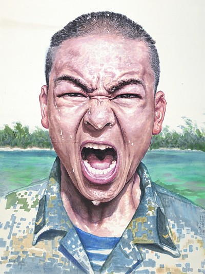 党的十八大以来,无论是新观念的表达还是新形式的探索,军事题材美术创作都坚持从不同的角度和层面探索“战争与和平”“人民与国家”“个人意志与家国情怀”等命题,把对艺术本体的探索成功地融入主题性美术创作中。李翔的《南海·南海》把传统笔墨技法与西方造型方式相结合,通过人物面部表情的丰富刻画,突出浓烈的时代特质;孙浩的《逐梦海天的强军先锋——张超》,整体画面因直线条的大量应用而显得十分硬朗,红色的天空营造出霞光满天的视觉效果;骆根兴的《东风第一枝——火箭军某导弹旅》在画面环境中安排了大面积的山石,突出核导弹的力量感;罗田喜的《三栖尖兵——刘珪》中,简洁的笔触定格了英雄训练生活中的精彩画面,体现出军人的英姿飒爽。此外,窦鸿的《雪中餐》、夏荷生的《凝固的军魂》、许向群的《起航》、陈林的《钢与火》、周长春的《和平使命·蓝色交响曲》、阮梅和韩博的《众志成城》等作品通过对铁血阳刚的军人形象的塑造,展现出钢铁之师的血性与担当,也展示出强军路上现代军人的人性品格。