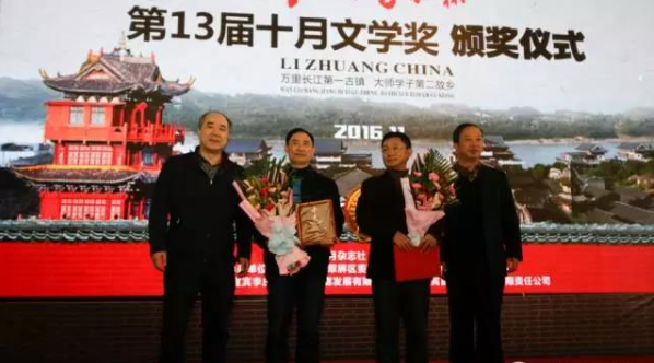 中国·李庄杯”第十三届十月文学奖,11月10日在四川宜宾李庄颁奖。图为十月杂志主编为获奖作家阿来与周云和颁奖(图片来源:十月杂志)