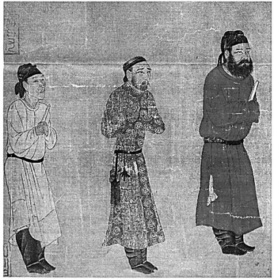 在青海都兰,考古人员发现了一些对鸟纹样和花草组合在一起的丝织品残片。而这与考古人员在新疆吐鲁番阿斯塔那发现的丝织品纹样非常接近。在丝绸制品出土之前,过去我们想了解古代吐蕃人穿什么样的衣服,用不用丝绸材料,资料非常少,唯一可供参考的是相传为唐代阎立本绘制的《步辇图》(图6),图6中间这个人就是我们之前提到的吐蕃重臣禄东赞,他来大唐是献金银器以及求娶文成公主的。观察《步辇图》中他的穿着,很可能也是丝绸制作的。