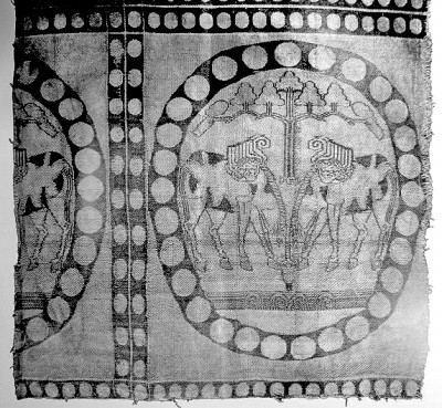 另外,在吐蕃的织锦图案里面,还有一些外来文化的因素值得我们注意。举一个例子,我国南北朝时期,南朝梁的普通元年(公元520年),西域的一个小国叫作滑国,它向梁朝献方物,其中就提到了“波斯锦”。而在吐鲁番文书的公元5世纪购物账中,也提到了“钵(波斯)锦”,衣物疏中也有“波斯锦”“波斯锦面依(衣)”“波斯锦被辱(褥)”等等。目前出土的年代最早的波斯锦是在新疆的阿斯塔那墓地,是一件唐朝武德二年(公元619年)的猪头纹锦。