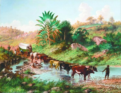 牛是重要的役畜,在一些时候可以替代马执行货物运输的任务。这幅作品中,英国画家贝恩斯记录下了19世纪在南非考察时的场景。