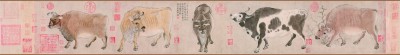中国古代有许多画牛的名作,如戴逵的《三牛图》、谢稚的《三牛图》、韩滉的《五牛图》、廓庵禅师的《十牛图》,而马贲、李唐、江参等名家也都绘制过《百牛图》等佳作。除此之外,韩滉的《公牛图》《乳牛图》《归牧图》等,戴嵩的《奔牛图》《戏牛图》《斗牛图》《白牛图》《水牛图》等,杨晋的《王石谷骑牛图》,以及多个版本的《老子骑牛图》(晁补之、张路、陈洪绶等绘制)也已成为传世佳作。其中,韩滉的《五牛图》影响力极为深远,几乎成为海内外广大欣赏者对“中国牛”鉴赏的范本。韩滉的《五牛图》被称为中国的十大传世名画,是少数留存下来的唐代画作之一。画面上的五头牛神态各异,性情亦似有别,能“曲尽其妙”。他画的牛笔墨稳健,姿态不同,生动有趣。左起一、二两头牛的神情形成了鲜明对照,让严肃与活泼两种神态在同一种动物身上得到了非常切合的诠释。处在中心位置的第三头牛继续沿用前两头的篆隶笔法,波浪纹理让处于正面视角的这头牛凸显了一种沉稳与谦和。黑白相间的第四头牛气宇轩昂,与第五头的悠闲相映成趣,这最右一头对颈部肌理的处理,在动感中又增添了几分闲适。整个画卷呈现出一派中正、祥和的氛围,也反映了农耕文明中人与自然的和谐美好。