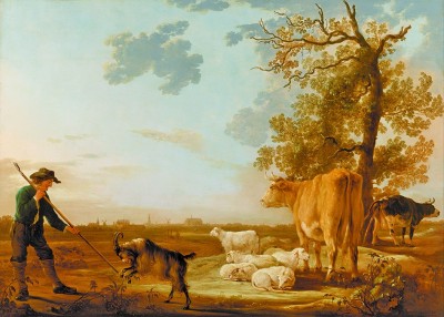 埃尔伯特·库普是荷兰杰出风景画家,这幅画中,牛羊在树下休憩,一头黑羊在与牧人互动,远处有着许多风车,真实地还原了当年荷兰乡下的风光。