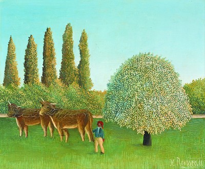卢梭是法国艺术史上的伟大画家之一,他热衷于创造一个幻想的世界,画作充满天真烂漫的色彩,他笔下的牧童与牛如在童话世界,浪漫温情。