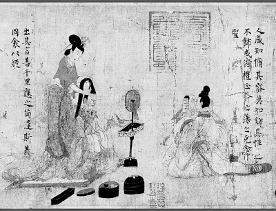 晋朝妇女穿红色广袖短襦,绿色长裙。(晋)顾恺之《女史箴图》(局部)