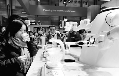 作者认为人工智能也应成为新文科关注的领域。图为世界移动通信大会上海展的参观者在品尝由机器人制作的咖啡。新华社发