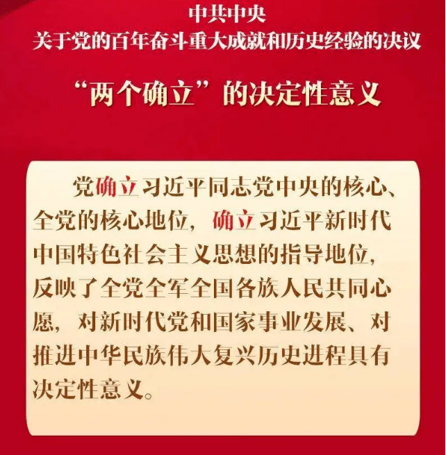 从事关中华民族前途命运的高度,深刻领会“两个确立”的决定性意义,不断增强做到“两个维护”的思想自觉、政治自觉、行动自觉。《决议》指出:“党确立习近平同志党中央的核心、全党的核心地位,确立习近平新时代中国特色社会主义思想的指导地位,反映了全党全军全国各族人民共同心愿,对新时代党和国家事业发展、对推进中华民族伟大复兴历史进程具有决定性意义。”“两个确立”是历史的选择、时代的呼唤、人民的愿望,具有坚实的政治认同、思想认同、理论认同和情感认同基础。习近平总书记展现出的坚定信仰信念、鲜明人民立场、非凡政治智慧、顽强意志品质、强烈历史担当、高超政治艺术,赢得全党全国各族人民衷心拥护,赢得国际社会高度赞誉。习近平新时代中国特色社会主义思想是当代中国马克思主义、二十一世纪马克思主义,是中华文化和中国精神的时代精华,其科学性和真理性已经被党的十八大以来党和国家事业取得的历史性成就、发生的历史性变革所证明。新征程上,我们要深刻领会“两个确立”的决定性意义,始终把“两个维护”作为党的最高政治原则和根本政治规矩,坚决做到忠诚核心、拥戴核心、维护核心、捍卫核心,自觉做习近平新时代中国特色社会主义思想的坚定信仰者、忠实实践者。