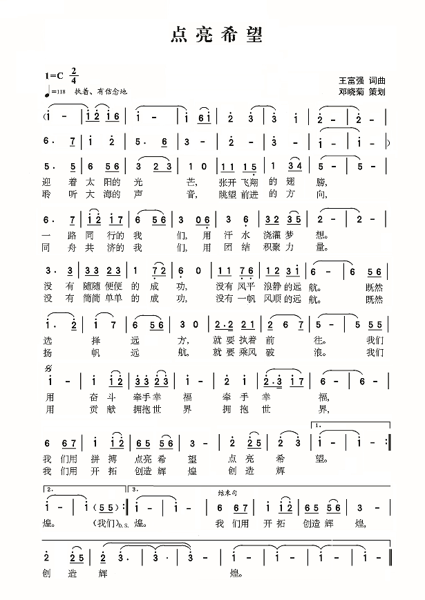 天津南开音协副主席、《乐理新说》开创者王音宣先生认为:“《点亮希望》一歌,不管是歌词,还是曲调,以至于各种形式的演唱,都会产生一种‘结构简易,平淡无奇’的印象。但仔细观察、聆听,静心品尝、体会。却总会有一种说不清、道不明的内在潜力,在无形地支撑着!创作者没有选择一般惯用的表现手段即新颖的生活素材和独特的旋法以及常用的修辞手法而着墨,却从新的角度并利用深层含义的张力而开掘,巧妙地打造出质朴无华的‘光彩亮点’。《点亮希望》一词的‘核儿’,正是将虚拟的‘幸福’与肉眼可见的实在行动‘牵手’搭配;将虚拟的‘希望’与肉眼可见的实在行动‘点亮’搭配。形成虚虚实实的交合物,使其生动鲜活起来,巧妙地放在曲调的黄金分割线上,加以渲染,使其呼应,故而神不知鬼不觉地彰显出内在钢筋气质,无穷的力量。从而打造出光彩照人的黄金‘亮点’。不仅如此,还将词的‘核儿’作为命题:‘点亮希望’,放在显赫的位置。这样就将高度概括而又抽象的政治主题塑造成情绪饱满、慷慨激昂和栩栩如生的鲜明艺术形(声)象,展现在读者和听者面前,鼓舞人心,使之动情。故此,可圈可点,令人称赞!”