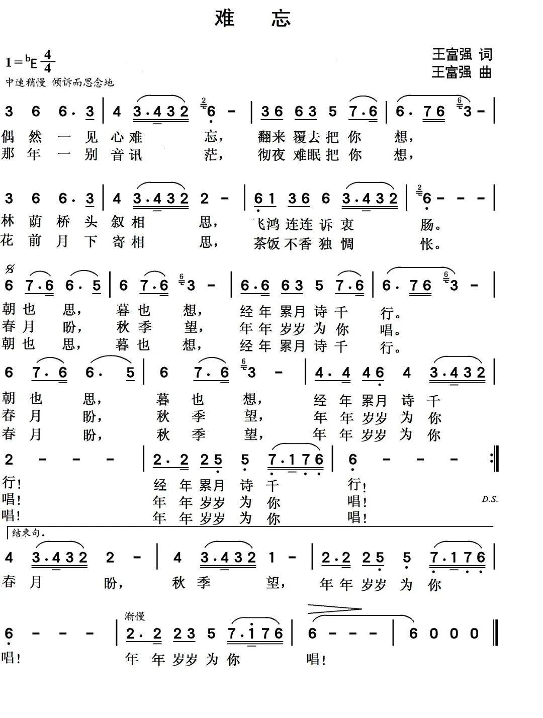 80年代后期和90年代初期,无论是在学校任教或是后来进入行政机关工作,白天正常上班后晚上很少开会、加班。夜间,我被受邀在灯光明亮、众人瞩目的大众歌舞厅里担任主奏、主唱(这是那些年里我公开的第二职业),于是自然而然地将《难忘》传入了歌厅和舞厅。之后,相继出现了清唱版、点唱版、风琴版、钢琴版、二胡版、竹笛版、民谣版、公园版、乐队伴奏版、活动演唱版、专业录制版等多种形态的关于《难忘》的演唱和传播。众多演唱版本里,以歌手林霞演唱录制的版本传播最广。我自己也曾进棚唱录过一版,但担心有人说我作为一名行政干部不务正业或抢了歌唱家们的饭碗,故从没上传到网上或发给文艺同行们交流。再之后,我将珍藏的手稿和林霞演唱的《难忘》版本上传到中国原创音乐基地、中国曲谱网等平台,并简略地写下了创作故事。之后,《难忘》随《王富强原创歌曲集②》登录QQ音乐、酷狗音乐、酷我音乐、简谱与歌谱网、腾讯视频空间、搜狐网、视频号等平台,乘着数字翅膀飞向了千万人耳畔。