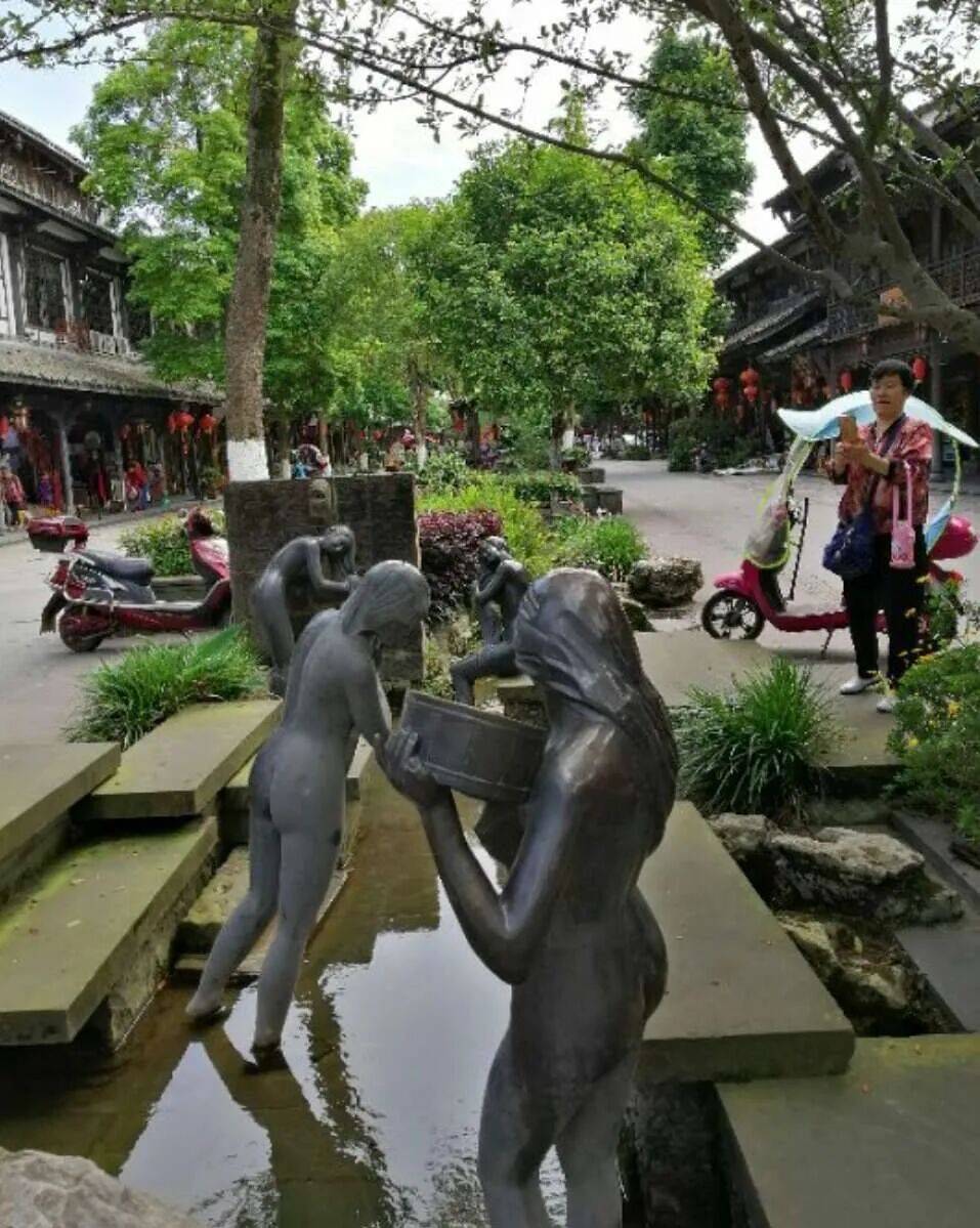 最是铜雕吸引人……活灵活现,栩栩如生,分明是古代小家小户生活的写照。艺术的最高境界,明明是没有生命的物体,总感觉他们(她们)是鲜活的。瞧,养家护院的小狗,还有几只鸡在院子里悠闲行走,偶尔啄啄粘土,翻找虫子。干了一天农活的男人回到家,光着脚,用大海碗盛着饭菜,坐在院子里的小石凳上,小狗摇着尾巴走上前来。清晨或者傍晚,小姑娘抱着个有谷粒的簸萁出来,小鸡全部围上去。还有渔翁、竹排、钓者、洗衣女、浴女……