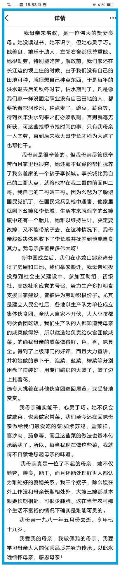 姑姑李长碧微信文章如下: