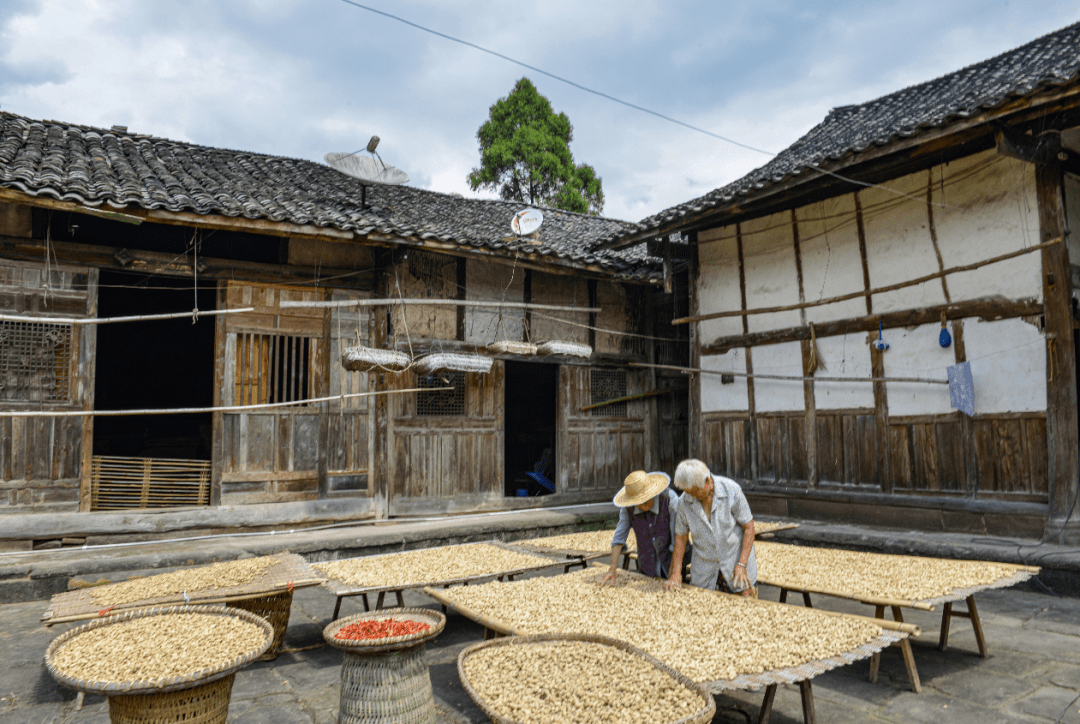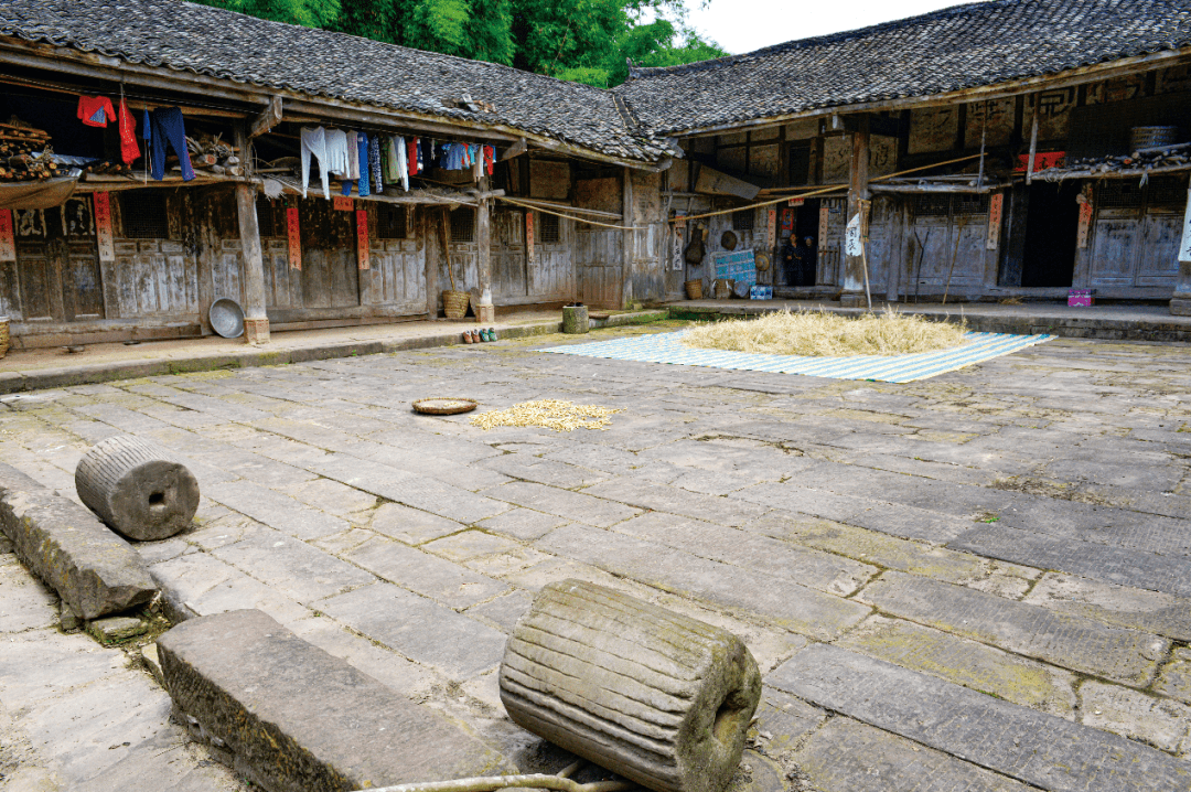 沿着平整的水泥村道,从西边进入院落,很快,一间间古朴沧桑的木板屋就出现在眼前。石板路、石碾子、木板屋、木格窗、木踩楼、木桶、竹篱笆、竹背篓,等等,都是深藏于人们记忆中的那个样子,只是如今人去楼空,很多老物件都蒙上了灰尘,沾上了晦暗苔藓。这么多年,它们一直守候在这里,仿佛是在等待着人们回来,将所有物件逐一擦拭干净,然后派上各自的用场,让家的温暖气息重新归拢并散发开来。当然,村里还是有一些老幼妇孺留守下来,养猪养鸭,春种秋收。在粗壮柱头和厚实木门之间,他们拾掇鸡零狗碎,收拣锄头镰刀,将日子过得有条不紊、波澜不惊。阳光透过青瓦屋顶或巷道缝隙照射下来,人与物的影影憧憧间,恍如隔世般,给人一种穿越时光的错觉。