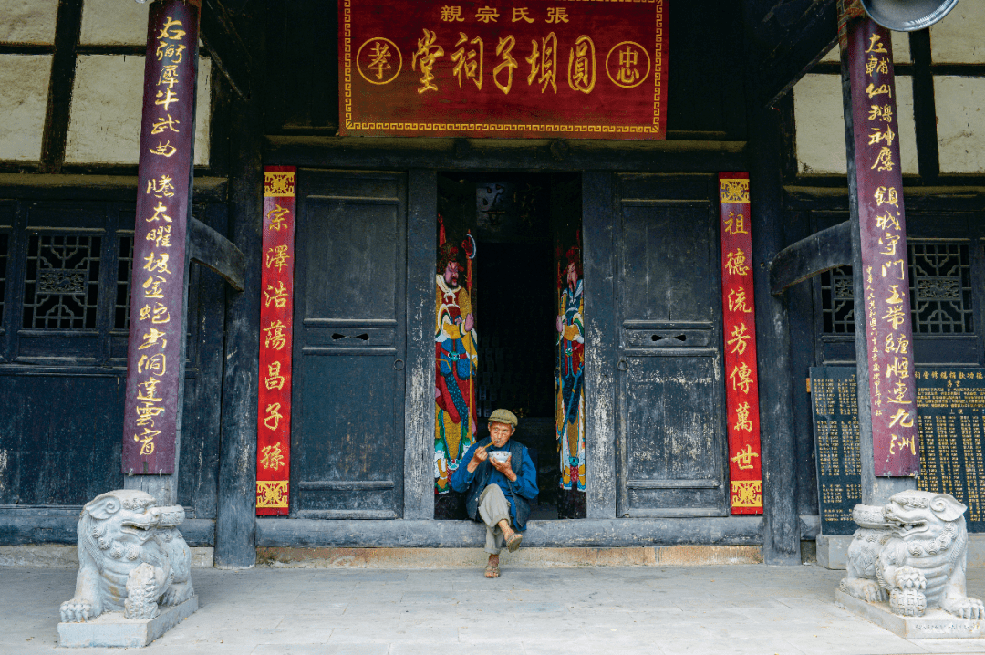 在“张氏宗祠”门前,我们遇见了一位老人,中等个子,精神矍铄,热情健谈。老人名叫张仁宪,今年72岁,膝下一子一女都已成家立业。与村里其他人户一样,家里的年轻人都在外面打工,未成年的孙辈则在附近镇上读书。平常日子,张仁宪老人和70岁的老伴相濡以沫,住老木屋,吃柴火饭,喝深井水,力所能及地种一些粮食蔬菜,养一两头过年猪,过着与世无争的闲散生活。经过攀谈得知,圆坝子古院落属兴隆村五组,共有十重院子、120多户人、房屋200多间,除了一户赵姓之外全是张姓。这些古建筑修造时间基本都在清朝同治年间,其中最为古老的是张军家里的堂屋,修建于明末,距今已300多年,除了房梁老朽、神龛牌位损毁之外,木柱依旧粗壮稳固,整体架构仍保持原貌。